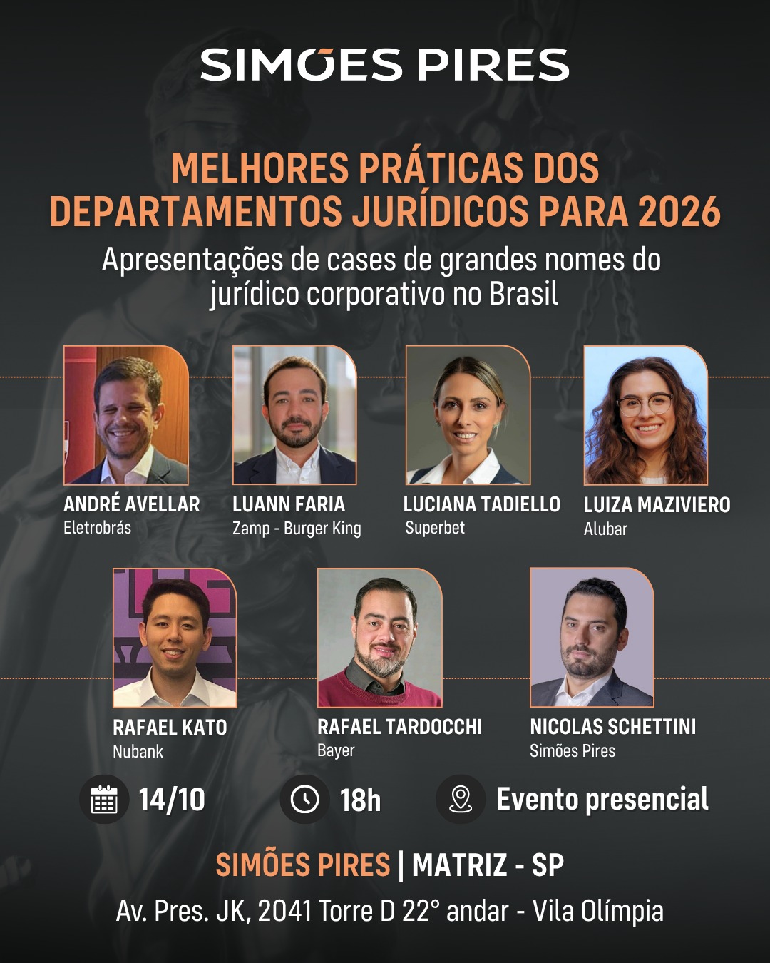 O evento de apresentação de cases com as melhores práticas dos departamentos jurídicos para 2026 acontece na sede do Simões Pires, em São Paulo, na avenida Presidente Juscelino Kubitschek, 2041, torre D, 22º andar, na Vila Olímpia.
