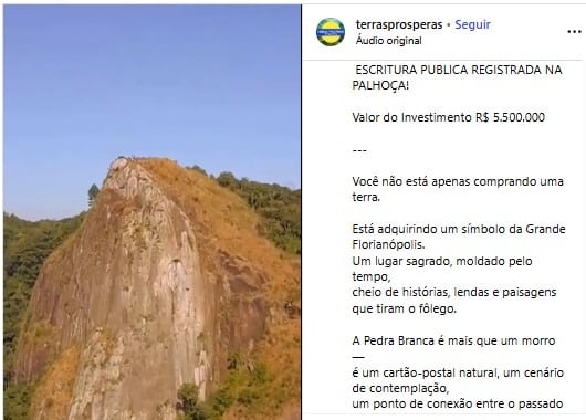 Terreno de quase 250 mil m² no Morro da Pedra Branca foi anunciado nas redes sociais no último sábado.